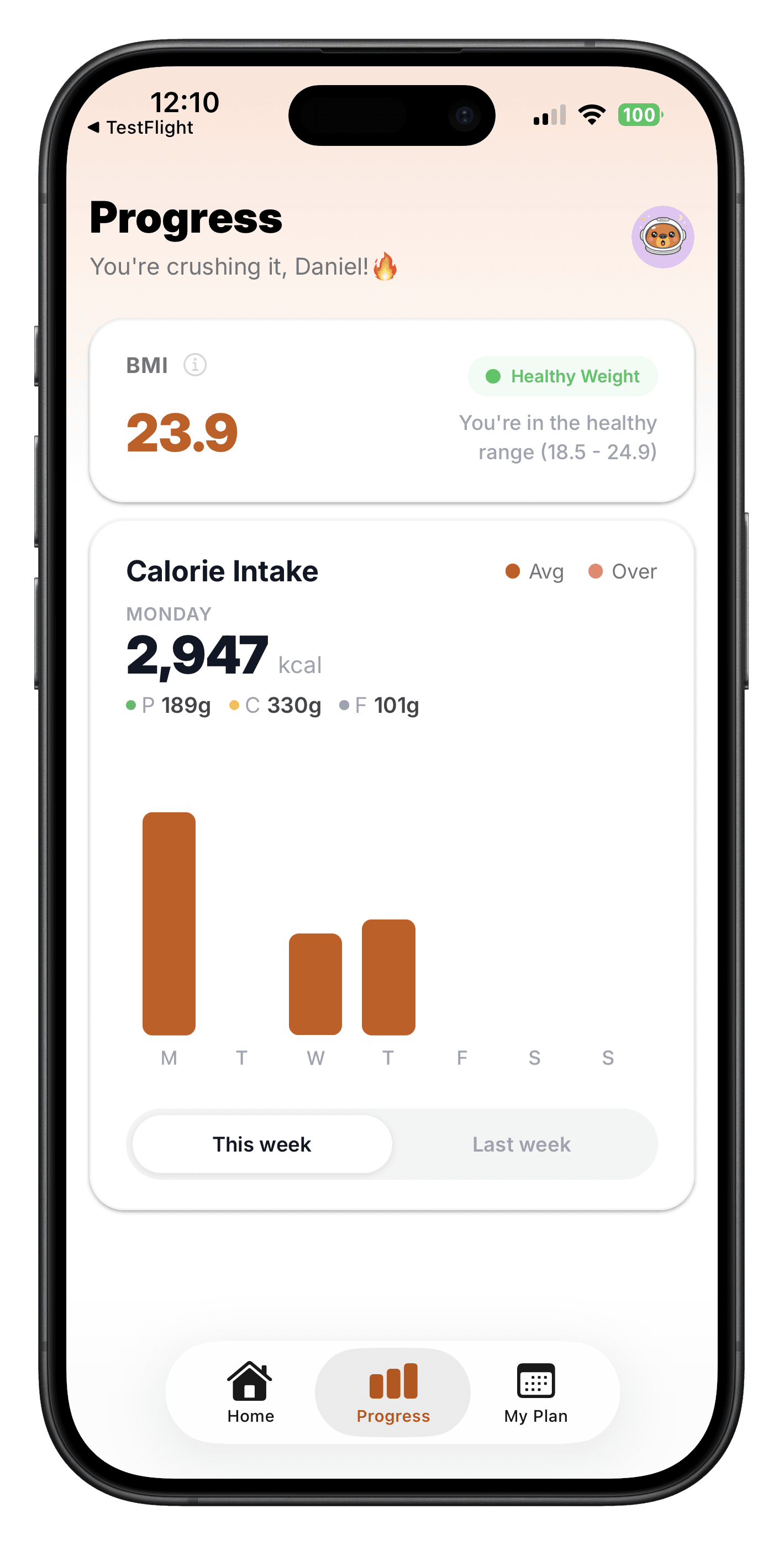 BMI, weekly calorie trends, and macro breakdowns to keep you on track